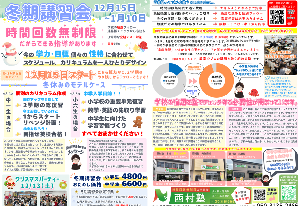 夏期講習生募集のご案内 西村塾の冬期講習生募集! がんばりたい子、自分を変えたい子、大募集。 ↓ご案内 まずはチラシをご覧ください↓ 開校時間 作成中… 開校時間であれば、時間回数無制限で学習できます。教室内で昼食等をとることもできます。 無試験先着順です。満席時はご容赦くださいませ。まずはお電話か公式LINEにてお問い合わせください! Post Views: 607
